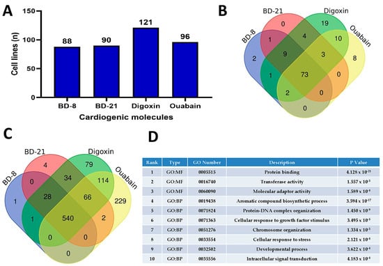 In silico prediction of cytotoxicity and gene expression changes by BD-8 and other cardiotonic molecules. (A) Number of tumor and non-tumor cell lines with predicted cytotoxicity scores for BD-8, BD-21, digoxin, and ouabain using CLC-pred2.0. (B) Venn diagram of shared cell lines predicted for cytotoxicity using CLC-pred2.0. (C) Venn diagram displaying shared gene expression changes predicted in human cell lines MCF7 and VCAP by in silico treatment with BD-8, BD-21, digoxin, and ouabain using DIGEP-Pred. (D) Functional enrichment (gene ontology–GO) with shared gene expression among all four cardiotonic molecules (540 gene transcripts) using g: Profiler. The ranking was based on the adjusted P values. BD: γ-benzylidene digoxin derivate. BP: biological process. MF: molecular function.