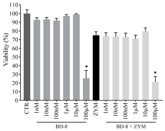 As shown in Figure 3, cell viability was not affected by BD-8 at concentrations up to 10 µM in the absence or presence of ZYM when compared to the control group. On the other hand, BD-8 at the highest concentration (100 µM) reduced cell viability and was not used in the following assays.