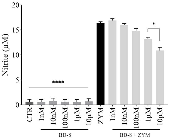 Effect of BD-8 on nitric oxide production. Murine peritoneal macrophages were treated with varying BD-8 concentrations (1 nM, 10 nM, 100 nM, 1 µM, and 10 µM) in the absence or presence of 0.2 mg/mL ZYM. After 24 h, the nitric oxide production was determined by Griess reagent. Results were expressed as mean ± SEM and analyzed using GraphPad Prism® software version 10.0.0 using one-way analysis of variance followed by Tukey’s test for multiple comparisons. ****—(p < 0.0001); *—(p = 0.05). CTR: Control; ZYM: Zymosan.
