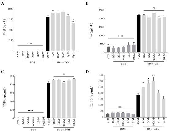 Effect of BD-8 on cytokine production. Murine peritoneal macrophages were treated with varying BD-8 concentrations (1 nM, 10 nM, 100 nM, 1 µM, and 10 µM) in the absence or presence of 0.2 mg/mL ZYM. After 24 h, the IL-1β, IL-6, IL-10, and TNF-α release were determined by enzyme-linked immunosorbent assay. (A) production IL-1β; (B) production IL-6; (C) production TNF-α; (D) IL-10. Results were expressed as mean ± SEM and analyzed using GraphPad Prism® software version 10.0.0 using one-way analysis of variance followed by Tukey’s test for multiple comparisons. ****—(p < 0.0001); **—(p = 0.01); *—(p = 0.05). CTR: Control; ZYM: Zymosan; ns: not significant.
