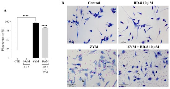 Effect of BD-8 on phagocytosis of ZYM particles. Murine peritoneal macrophages were treated with 10 µM BD-8. After 24 h of incubation, the cells were stimulated with 0.2 mg/mL ZYM (B) representative phagocytosis ZYM particles in and incubated again for 40 min and the phagocytosis was evaluated. (A) Results were expressed as mean ± SEM and analyzed using GraphPad Prism® software version 10.0.0 using one-way analysis of variance followed by Tukey’s test for multiple comparisons. ****—(p < 0.0001); Black arrows–phagocytosed ZYM particles.