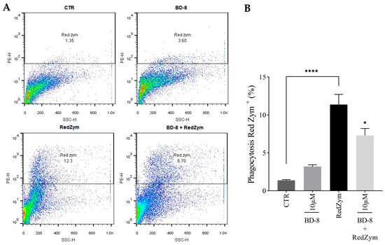 Effect of BD-8 on phagocytosis. Murine peritoneal macrophages were treated with 10 µM BD-8. After 24 h of incubation, the cells were stimulated with 1:10 red ZYM (representative fluorescence dot plots (A) and incubated again for 40 min and the phagocytosis was evaluated. Flow cytometry data were analyzed using FlowJo® X software version 10.6.2. (B) Results were expressed as mean ± SEM and analyzed using GraphPad Prism® software version 10.0.0 using one-way analysis of variance followed by Tukey’s test for multiple comparisons. ****—(p < 0.0001); *—(p = 0.05). CTR: Control; RedZym: Red ZYM.