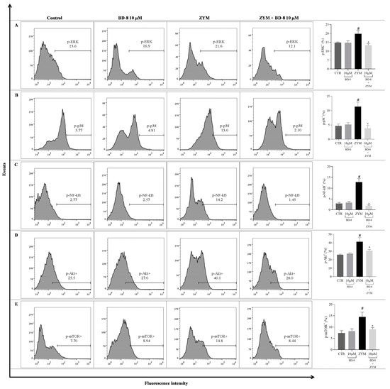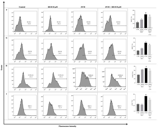 Effects of BD-8 on intracellular molecules associated with inflammatory processes and histograms. Peritoneal macrophages were stimulated with 0.2 mg/mL ZYM and treated with 10 µM BD-8. The cells were evaluated by flow cytometry and marked with specific antibodies for intracellular molecules. (A) p-ERK+; (B) p-p38+; (C) p-NF- κB+; (D) p-Akt+; (E) p-mTOR+; (F) ROS+; (G) iNOS+; (H) COX-2+; (I) Src+. The numerical data are presented as mean ± SEM with an average of n = 5 and were analyzed using one-way analysis of variance (ANOVA), followed by Tukey’s post-test. # p < 0.05, significant in relation to the control group; * p < 0.05, significant in relation to the ZYM group. CTR: Control; ZYM: Zymosan; ns: not significant.