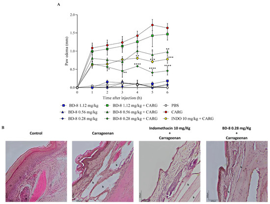 Effect of BD-8 in paw edema. BD-8 dose-response curve (A). Histological examination of paw tissue (B). Mice were pretreated with 1.12 mg/kg, 0.56 mg/kg and 0.28 mg/kg BD-8 for 3 and 1 hour after the last BD-8 treatment, mice received intraplantar injections of carrageenan in 20 μL PBS in the right hindpaw, and 20 μL of PBS in the left hindpaw. Indomethacin (INDO 10 mg/kg) was used as anti-inflammatory control and injected i.p. one hour before intraplantar challenge. Asterisks denote the significance levels compared with carrageenan group. Data were expressed as mean ± S.E.M. and analyzed by software Graphpad Prism using Student’s t-test followed by unpaired test. ****—(p < 0.0001); ***—(p = 0.001); **—(p = 0.01); *—(p = 0.05). (a)—Epidermal layer wear; (b)—Edema formation; PBS–Control group; CARG–Carrageenan; INDO–Indomethacin.