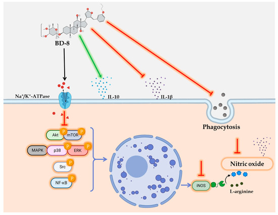 Besides the mechanism involving the Na+/K+-ATPase, cardiotonic steroids have been described as interacting with retinoic acid-related nuclear receptor (ROR)-γ inside the cell [72]. This raises the possibility that the immunomodulatory effect of BD-8 may be partially mediated through ROR-γ modulation, although further studies are needed to elucidate its interaction both in vitro and in vivo. In summary, our data suggest that treatment with BD-8 modulates macrophages immune response, potentially by decreasing phagocytosis processes, nitric oxide, and IL-1β levels through the suppression of the MAPK p38-ERK/NF-κB/Akt/mTOR/Src/iNOS signaling pathways (Figure 10).