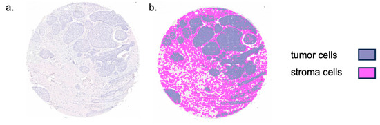 Representation of TMA core tissue segmentation. (a) Sample tissue microarray (TMA) core of basal cell carcinoma. (b) Colored tissue segmentation overlaying the TMA core. Tissue was separated into tumor and stromal tissue as displayed.