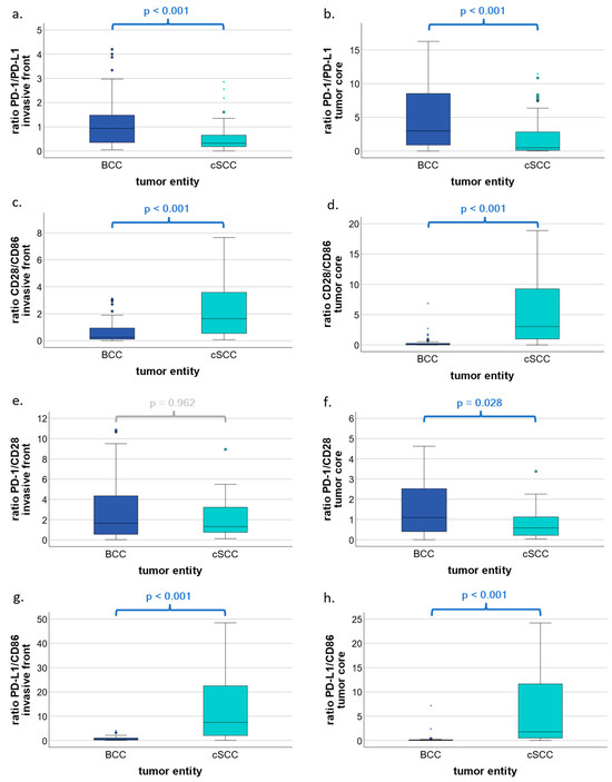 The ratio of PD-1/PD-L1 was significantly higher in the invasive front (p < 0.001; Figure 3a) as well as in the tumor core (p < 0.001; Figure 3b) in favor of BCC as compared to cSCC. Significantly higher ratios were also found in the ratios of CD28/CD86 and PD-L1/CD86 between cSCC and BCC in both the invasive front (p < 0.001; Figure 3c,g) and the core (p < 0.001; Figure 3d,h) in favor of cSCC. Finally, the ratio of PD-1/CD28 was significantly higher in BCC as compared to cSCC tumor cores (p = 0.028; Figure 3f). Additional results are available as Supplementary Table S1 accompanying the online article.