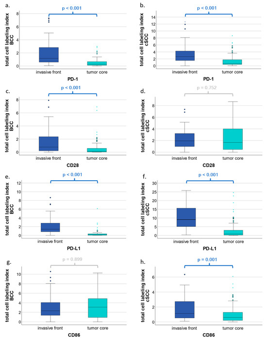 In summary, all antibodies except CD86 showed significantly higher levels in cSCC as compared to BCC for both the invasive front and the tumor core. Only the CD86 expression was significantly higher in BCC as compared to cSCC for both compartments.