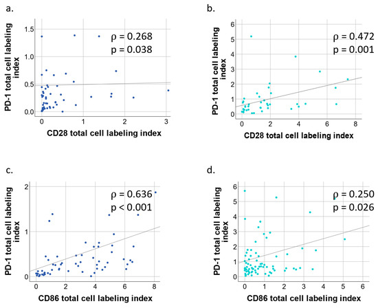Spearman correlation for PD-1, CD28, PD-L1 and CD86 was performed for both BCC and cSCC by total cell LI. In BCC, a moderate positive correlation (ρ = 0.40 to 0.59) was obtained for PD-1/PD-L1 (ρ = 0.496, p < 0.001) and PD-L1/CD86 (ρ = 0.522, p < 0.001). A strong correlation (ρ = 0.60 to 0.79) was achieved for PD-1/CD86 (ρ = 0.636, p < 0.001; Figure 5c). In cSCC, a moderate correlation was achieved for PD-1/CD28 (ρ = 0.472, p = 0.001; Figure 5b).