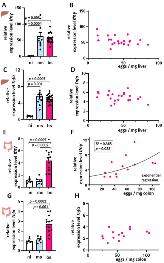 (A–D) S. mansoni infection-induced Th1 cytokine response was independent of hepatic egg burden. (A) Increased Ifnγ expression in livers of ms- (n = 10) and bs-S. mansoni-infected hamsters (n = 22). (B) No correlation between Ifnγ expression and hepatic egg load in bs-infected hamsters was observed. (C) Tnfα expression increased in livers of ms- (n = 10) and bs-S. mansoni-infected hamsters (n = 22). (D) No correlation was found between Tnfα expression and hepatic egg load in bs-infected hamsters. After performing qRT-PCR, the analysis of the data was performed using the 2−∆∆CT method. (E) Ifnγ expression was induced in the colon of bisex-infected hamsters. (F) Ifnγ expression in the colon exponentially correlated to the egg load in the colon. (G) Tnfα expression was induced in the colon of bisex-infected hamsters. (H) Tnfα expression showed no correlation to egg burden in the colon. The ni group (n = 6) served as control. Three technical replicates were performed, and their mean values were determined. The equal distribution of expression values between the groups was tested using the Kruskal–Wallis test (p < 0.001) (A,C,E,G). In the regression analyses, egg load served as the independent variable, and fold increase in Ifnγ mRNA as the dependent variable.