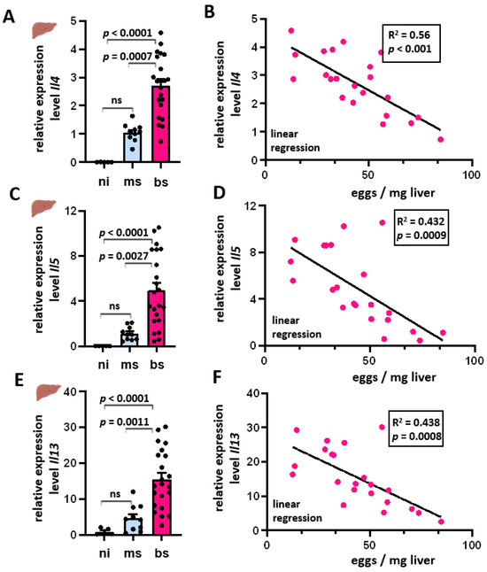After the parasite starts producing eggs, the hepatic Th1 immune response shifts to a Th2 response [9], with IL-4, IL-5, and IL-13 being the prevalent cytokines involved. Their mRNA levels were determined in the liver samples of bs-, ms-, and ni-animals. Il4, Il5, and Il13 showed different expression levels between the groups (Figure 3A,C,E). In the ni control group, the mRNAs of these three cytokines were hardly detectable. A slight cytokine expression was measured in the ms-infected group, whereas bs-infected animals showed up to 4.6-fold (Il4), 10-fold (Il5), and 30-fold (Il13) increased mRNA levels. Regression analyses showed an inverse linear dependence of cytokine expression on egg load (Figure 3B,D,F). The coefficients of R2 determination were 0.560 (Il4), 0.432 (Il5) and 0.438 (Il13), respectively.
