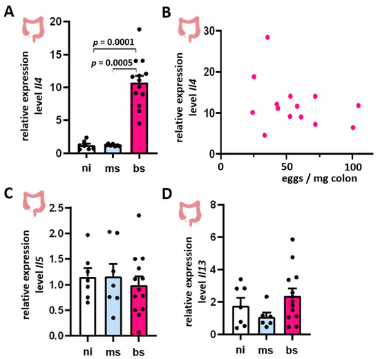 Il4 expression was induced in the bowel of bs-infected hamsters (Figure 4A). However, we observed no correlation between the Il4 expression and the intestinal egg burden (Figure 4B). Notably, Il5 and Il13 expression levels showed no group differences and, therefore, no correlations with the intestinal egg load (Figure 4C,D).