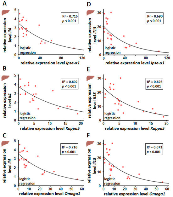 Inverse correlation between hepatic Il4 (A–C) or Il13 mRNA (D–F) and the gene expression of the different soluble egg-dependent factors Ipse/α1, Kappa5 and Omega1.