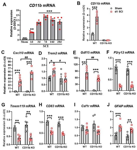 As a first step in exploring the role that CD11b plays in acute neuroinflammation, we used qPCR analysis to examine the changes to its expression level at multiple timepoints after SCI. We observed a significant increase in CD11b mRNA expression starting at 1 d post-injury, reaching its peak at 7 d and remaining persistently high for up to 28 d (Figure 1A). Next, we examined the effects of CD11b ablation on microglia and monocyte markers, along with genes that reflect their phenotypic functions. At 1d after SCI, qPCR analysis showed near-zero levels of CD11b (Itgam) mRNA expression in both sham and SCI of CD11b KO mice, as expected (Figure 1B). Furthermore, the gene Cxcl10, a chemokine well-known for inducing microglia migration and initiating microglial activation [], showed significant increases in the injured spinal cord of both genotype groups, with CD11b KO mice showing even higher levels (Figure 1C). In contrast, the gene Trem2, which is expressed in microglia and other myeloid cells of the CNS, showed a marked increase in SCI/WT mice, but no injury-induced changes were observed in CD11b KO mice (Figure 1D). As a member of the transforming growth factor beta superfamily and known as macrophage inhibitory cytokine-1 (MIC-1), the expression levels of Gdf15 were very low in both sham groups but showed significant increases after injury. Pairwise comparison of SCI/WT with SCI/CD11b KO mice showed significantly lower expression levels in the latter group (Figure 1E). Other microglia and myeloid cell markers that we tested included P2ry12, Tmem119, CD83, and Csf1r. The markers P2ry12 (Figure 1F) and Tmem119 (Figure 1G), both of which are abundantly expressed in ramified microglia [,], showed a significant decrease after 1d SCI without genotype effects. The gene CD83 plays a critical role in controlling and resolving immune responses, showed significantly lower mRNA levels in injury groups (Figure 1H), but no genotypic differences were observed. Finally, the gene that encodes microglial receptor Csf1r showed neither injury nor genotype effects (Figure 1I). In addition, both WT and CD11b KO mice showed marked upregulation of Gfap at 1 d post-injury, but no genotype effects were observed, suggesting that genetic depletion of CD11b did not affect astrocyte function (Figure 1J). Collectively, acute SCI leads to increased levels of genes that initiate inflammation-resolving processes and drive myeloid cells towards clearance of damaged tissue and debris, which is partially affected by CD11b ablation.