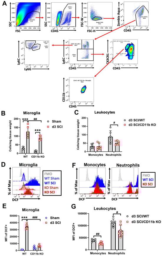 Genetic ablation of CD11b attenuates pro-inflammatory activation of microglia and monocytes at 3 days post-injury. (A) Gating strategy for microglia (CD45intLy6C−CX3CR1+), monocytes (CD45hiLy6C+Ly6G−), and neutrophils (CD45hiLy6C+Ly6G+) in CD11b KO mice. (B,C) Quantification of microglia (B) and myeloid (C) cell counts are shown. (D–G) Reactive oxygen species (ROS) and oxidative stress were measured using DCF. Main effects of genotype and injury are seen in the ROS production levels of microglia (D,E) and myeloid cells (F,G). *** p < 0.001 vs. sham groups. # p < 0.05, ## p < 0.01, ### p < 0.001 vs. SCI/WT. n = 5–6 mice/group. Two-way ANOVA followed by Tukey’s post hoc test.