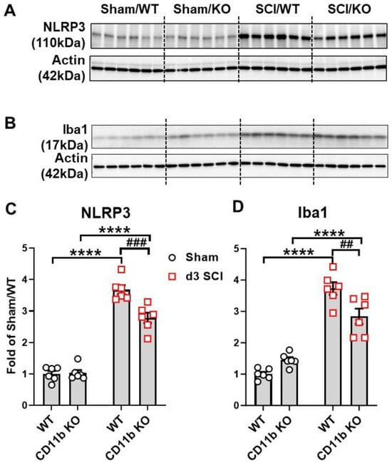 Genetic ablation of CD11b suppresses NLRP3 expression and Iba1 microglia/macrophages activation at 3 days post-injury. (A,B) Western blotting (WB) images show expression of inflammasome marker NLRP3 and microglia/macrophages marker Iba1. (C,D) WB quantification. **** p < 0.0001 vs. sham groups. ## p < 0.01, ### p < 0.001 vs. SCI/WT. n = 6/group. Two-way ANOVA followed by Tukey’s post hoc test.