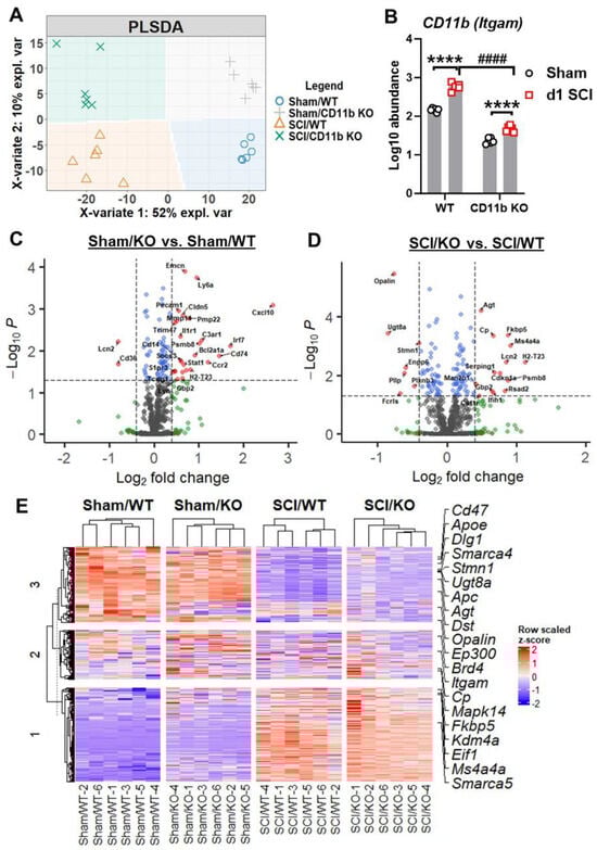 NanoString analysis of spinal cord tissue is performed at 1 day after SCI. (A) Partial least square differentiation analysis (PLS-DA) was performed with all normalized gene counts from the NanoString neuroinflammation panel. The two main components of variation were captured on the x- and y-axis and show a clear separation of clusters between the injury and genotype groups. (B) Log10 abundance of the Itgam (CD11b) gene was obtained from NanoString transcriptional data. **** p < 0.0001 vs. sham groups. #### p < 0.0001 vs. SCI/WT. n = 6/group. Two-way ANOVA followed by Tukey’s post hoc test. (C,D) Volcano plot of differentially expressed genes (DEGs) in the spinal cord of sham (C) and SCI (D) spinal cord samples with log2(fold-change) larger than 0.4 and log10(P) higher than 1.3 at the cutoff points depicted by dashed lines. (E) Heatmap of the top 20 DEGs in pairwise comparison between SCI/CD11b KO and SCI/WT. n = 6/group.