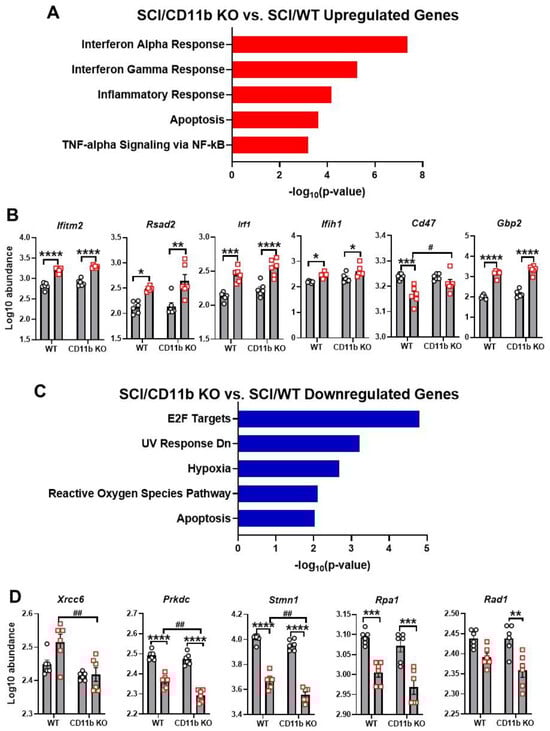 Enrichment analysis reveals potential pathways involved with CD11b-mediated neuroinflammation. (A,B) Pathway enrichment analysis of upregulated DEGs (A) with MSigDB Hallmark 2020 and genes involved with interferon alpha response (B). (C,D) Pathway enrichment analysis of downregulated DEGs (A) and genes involved with E2F targets (D). n = 6 mice/group. * p < 0.05, ** p < 0.01, *** p < 0.001, **** p < 0.0001 vs. sham groups. # p < 0.05, ## p < 0.01, vs. SCI/WT. n = 6 mice/group, two-way ANOVA followed by Tukey’s post hoc test.