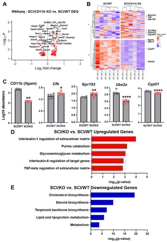 RNA sequencing of injured spinal cord samples at 1d SCI. (A) Volcano plot of DEGs obtained from bulk RNA-seq. (B) Heatmap of top 10 DEGs in SCI/CD11b KO vs. SCI/WT. (C) Log10 abundance of top 5 DEGs obtained from pairwise comparison. (D,E) Pathway enrichment analysis of up- and downregulated genes. * p < 0.05, ** p < 0.01, **** p < 0.0001 vs. SCI/WT. n = 6 mice/group, two-way ANOVA followed by Tukey’s post hoc test.