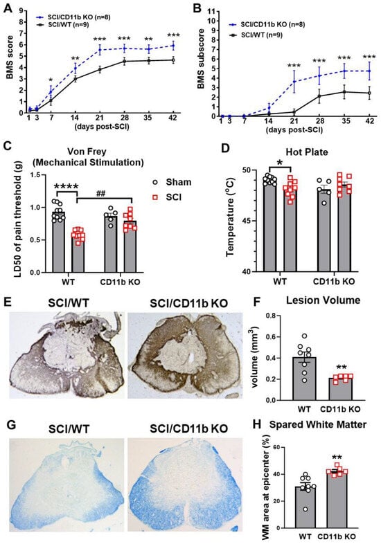 All surgical and experimental procedures in this study were performed under protocols approved by the Institutional Animal Care and Use Committee (IACUC) at the University of Maryland School of Medicine. To reduce the risk of bladder infection [,], we only used female mice in this study. Young adult (10–12 weeks) female CD11b KO mice were obtained from Dr. Li Zhang’s lab and maintained in the UMB animal facility. Following the induction of anesthesia by isoflurane, a laminectomy was carried out at approximately the T9 to T11 levels, and the spinal column was secured with metal clamps to the lateral processes. The mice were subjected to a midline contusion injury of the spinal cord at the T10 level using the Infinite Horizon Spinal Cord Impactor (Precision Systems and Instrumentation) with a force of 60 kilodyne, classified as moderate injury []. Manual bladder expression was carried out thrice daily for the first 7–14 days after SCI until reflex bladder emptying was re-established. For mice used as control animals, sham surgery was performed after anesthesia, consisting of only a laminectomy without contusion. Individuals who performed functional assessment and data analysis were blinded to group designations and genotypes throughout all experiment stages.