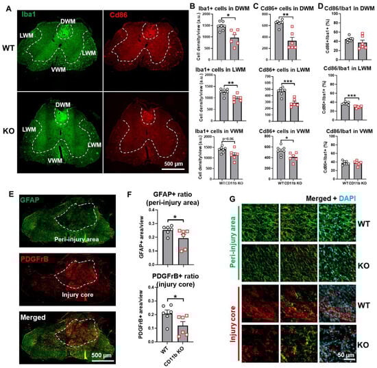 Chronic neuroinflammation and formation of fibrotic scars was alleviated in CD11b-KO mice after SCI. (A) IHC representative images of Iba1+(green)/Cd86+(red) cells at 0.4–0.6 mm rostral to the epicenter. Areas of dorsal white matter (DWM), lateral white matter (LWM), ventral white matter (VWM) are outlined for quantification. (B) KO mice exhibit significantly reduced Iba1 positive cells in DWM and LWM, not VWM after SCI. (C) Significantly decreased Cd86 positive cells are detected in all three regions in KO SCI mice. (D) The ratio of Cd86 and Iba1 double-positive cells show significant difference only in LWM between the two SCI groups. (E) Representative images demonstrate that PDGFrB (red) is mainly distributed inside the injury core while GFAP in the peri-injury area. (F) Either the relative GFAP-positive area or the relative PDGFrB-positive area are significantly lowered in KO mice in the two regions, respectively. (G) Representative images display the visual difference from GFAP or PDGFrB imaging between the two SCI groups in the peri-injury area or injury core. * p < 0.05, ** p < 0.01, *** p < 0.001 vs. SCI/WT. n = 6–7/group. Unpaired t-test. Scale bars = 500 µm (A,E) and 50 µm (G).
