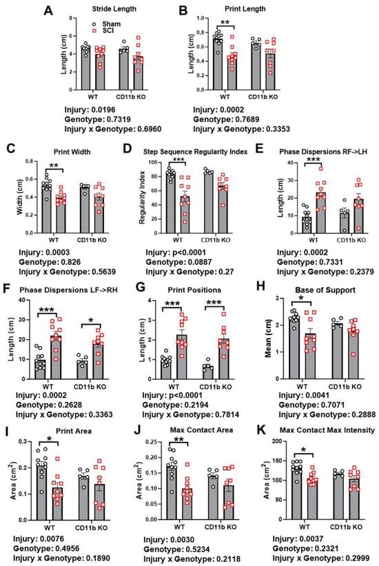 For further assessment of motor coordination, we used Catwalk XT gait analysis to examine fine motor differences beyond that recognizable by BMS scores. Stride length is the distance between successive placements of the same paw (Figure 9A), which showed a significant main injury effect between groups [F (1, 28) = 6.130, p = 0.0196], but no main genotype effect. Measurement of print length and width also found significant main injury effects [F (1, 28) = 18.03, p = 0.0002 for print length, F (1, 28) = 17.29, p = 0.0003 for print width], along with marked decrease in both parameters in WT mice following SCI (p < 0.01, Figure 9B,C), but deficits were not significant in CD11b KO mice. Representative footprint images are indicated in Figure S4. Next, we evaluated motor coordination with regularity index, a parameter that tracks the order of paw placement in a step cycle (Figure 9D). A single step cycle is defined as each of the four paws being placed on the walking surface in sequence, which was analyzed by attributing each set of steps into either a normal stepping pattern or abnormal gait. The result is a percentage of normal stepping out of all step cycles analyzed. As expected, the step sequence regularity index was significantly lower in SCI/WT mice compared to sham/WT (p < 0.01 vs. sham/WT, Figure 9D and Figure S4), indicating clear deficits in motor coordination, but this decrease was not significant in CD11b KO mice. Phase dispersions, a parameter that describes the temporal relationship between placement of two paws within a step cycle, was used to measure inter-paw coordination (Figure 7E,F). Assessment of the phase dispersions between right forepaw (RF) and left hind paw (LH) yielded significant increase in WT mice following SCI (p < 0.001, Figure 9E), but the deficits in CD11b KO were not significant. On the other side, which examines the diagonal dispersion of left forepaws (LF) and right hind paws (RH), deficits from SCI could be observed in both WT (p < 0.001) and CD11b KO mice (p < 0.05, Figure 9F). Moreover, both parameters showed significant main injury effects [F (1, 28) = 18.58, p = 0.0002 for RF- > LH; F (1, 28) = 31.56, p < 0.0001 for LF- > RH]. Print position is defined as the distance between a pair of hind paw and forepaw of the same side. Ideally, healthy C57BL/6 mice should be able to place their hind paw next to the location of the forepaw that has just been lifted from the walkway. Following SCI, the print positions of both WT and CD11b KO mice were significantly increased (p < 0.001, Figure 9G) while also showing an injury main effect [F (1, 28) = 44.44, p < 0.0001]. However, pairwise comparison of SCI/WT and SCI/CD11b KO yielded no statistical significance. Hindlimb base-of-support is a parameter that measures the average width of the track (distance between RH and LH) made by the animal, in which the farther apart the feet are placed during locomotion, the less likely the animal is to fall and the larger the base-of-support (BOS). Following SCI, WT mice showed significant decrease in hindlimb BOS (p < 0.05, Figure 9H), indicating a lack of coordination and trunk stability. We next examined print area, max contact area, and max contact max intensity, which could reflect spontaneous pain activity in mice (Figure 9I,J). The SCI/WT group showed a significant decrease in all three parameters, which suggests reduced contact with the Catwalk surface and the potential presence of spontaneous pain. However, no significant decrease was observed in CD11b KO mice, which suggests a lack of spontaneous pain and coincides with our results in mechanical and thermal allodynia.