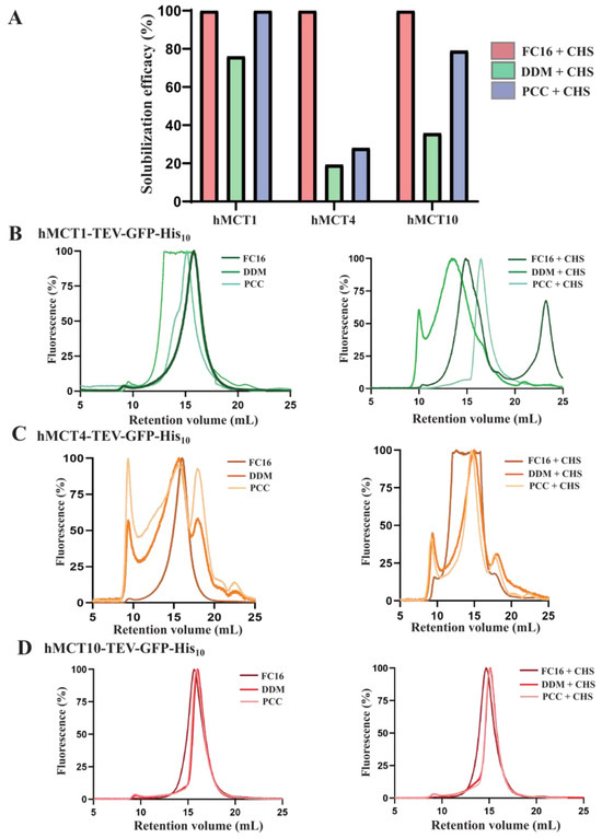 Figure 3. Detergent screening and fluorescent-detection size-exclusion chromatography (F-SEC) analysis of hMCT transporters. (A) Solubilization efficiency of hMCT1–, hMCT4–, and hMCT10–TEV–GFP–His10 crude membranes isolated from 2 L cultures of S. cerevisiae cells. All membranes were solubilized for 2 h at 4 °C in FC-16, DDM, and PCC (final concentration 1%, w/v) with or without CHS (0.2%, w/v), and the GFP fluorescence of the supernatant following ultracentrifugation was used to calculate percentage of the solubilization efficiency. (BD) F-SEC analysis of detergent-solubilized crude membranes overexpressing hMCT1–, hMCT4–, and hMCT10–TEV–GFP–His10, respectively. All membranes were prepared as in (A) and the solubilized fraction separated via ultracentrifugation was applied to a Superdex 200 Increase 10/300 GL column where the GFP fluorescence of the eluate was monitored.