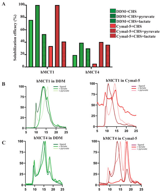 As previously mentioned, hMCTs are widely known to be involved in the transport of monocarboxylates (hMCT1/hMCT4) and aromatic amino acids (hMCT10). In this light, we set out to test if the presence of solutes during solubilization and F-SEC analysis can impact the efficiency of extraction and overall protein stability. hMCT1 and hMCT4 are primarily known to carry out the transport of monocarboxylates, including pyruvate and lactate. Hence, the solubilization efficacies of hMCT1 and MCT4 were tested in the presence of DDM and the related non-ionic detergent 5-cyclohexyl-1-pentyl-β-D-maltoside (Cymal-5) (Figure 4). The results showed that pyruvate but not lactate was able to enhance the solubilization efficiency of hMCT1 in both DDM and Cymal-5. On the contrary, for hMCT4, the presence of either solute resulted in a considerable two- and eight-fold increase in the cases of DDM and Cymal-5, respectively.