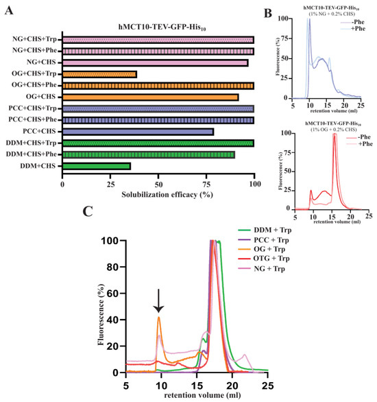 hMCT10 is primarily responsible for the transport of aromatic amino acids, although it is also known to have affinity for some monocarboxylates. We tested the impact of the presence of the aromatic amino acids Phe and Trp on the solubilization and protein homogeneity of hMCT10 (Figure 5A). Two different subclasses of non-ionic detergents were included in these tests, DDM and PCC, as well as the glucosides NG and OG. For hMCT10 solubilized in DDM and PCC, the addition of aromatic amino acids resulted in a boost in the efficacy towards 100%. A similar pattern was observed for hMCT10 extracted in NG. Surprisingly, hMCT10 extracted in OG in the presence of Phe exhibited a higher solubility efficacy, whereas the presence of Trp resulted in a significant loss in solubilization efficacy (~40%).