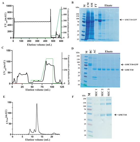 The large-scale purification of hMCT10–TEV–GFP–His10 was performed using affinity chromatography on crude membranes isolated from 40 g of fermenter-grown S. cerevisiae cells. Isolated membranes were solubilized in a final concentration of 1% (w/v) PCC + 0.2% (w/v) CHS in the presence of 2 mM Phe (4 h at 4 °C). hMCT10–TEV–GFP–His10 was eluted at a concentration of 300 mM imidazole with an overall yield of almost 10 mg following immobilized metal ion affinity chromatography (IMAC), although some protein was lost in the flow-through during the sample application (Figure 6). Analysis revealed a rather pure sample that was present primarily in a monomeric form following SDS-PAGE (Figure 6B). In the top two fractions, however, higher oligomeric states of the protein were also visible. Subsequently, the protein was subjected to treatment with TEV protease and reverse IMAC (RIMAC) purification to eliminate the remaining impurities and to remove the TEV–GFP–His10 tag, re-exposing the sample to the affinity resin and collecting the flow-through. The RIMAC chromatogram indicated successful cleavage of the C-terminal tag, as all of the hMCT10 protein was eluted during sample application. Additionally, SDS-PAGE comparison analysis of the before-cleavage (BC) and the after-cleavage (AC) samples indicated a shift in the overall size of the protein (from 85 to 55 kDa), further indicating a successful cleavage (Figure 6A–D).