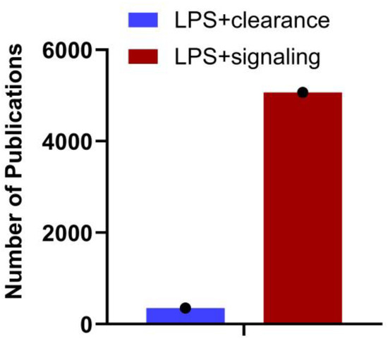 Number of articles published on LPS clearance vs. signaling. A search on NCBI using the keywords “LPS + clearance” and “LPS + signaling” reveals the number of articles published on each topic as of August 29th, 2024. The data underscores the importance of understanding LPS clearance.