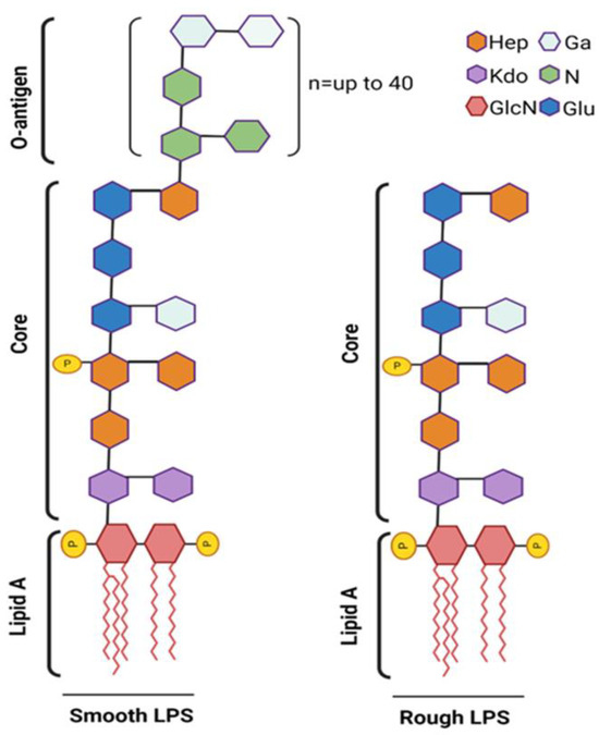Smooth LPS is characterized by the presence of a well-defined O-antigen polysaccharide chain, which extends from the core oligosaccharide region. The O-antigen is typically composed of repeating units of sugar molecules and imparts a smooth appearance to the bacterial cell surface under the microscope. Smooth LPS is often associated with virulent strains of bacteria and plays a key role in bacterial pathogenesis [33,34]. These immune responses are essential for the clearance of bacterial infections but can also contribute to the development of septic shock and systemic inflammatory response syndrome if dysregulated. The O-antigen region of smooth LPS is highly variable among different bacterial strains and is a major determinant of bacterial serotype specificity. This variability can impact the recognition of LPS by PRR such as TLR4 and influence the host immune response to bacterial infection [35].
