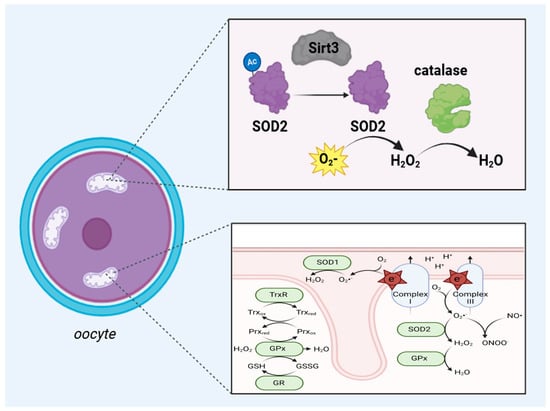 The upper part of this scheme shows the antioxidant activity of the SIRT3/SOD2/catalase axis in the mitochondria of oocytes. In the matrix of the mitochondria, upon the activity of SIRT3, the deacylation of SOD2 occurs, which is responsible for converting superoxide (O2) into hydrogen peroxide (H2O2), and catalase converts H2O2 into water. The lower panel shows a schematic drawing of ROS generation and inactivation in mitochondria. Most ROS originate from complexes I and III of the electron transport chain when electrons react with electrophilic oxygen molecules to produce superoxide (free radical O2). Superoxide is split into hydrogen peroxide (H2O2) by SOD1 in the mitochondrial intermembrane space and SOD2 in the mitochondrial matrix. Hydrogen peroxide is then further inactivated by the cooperation of glutathione peroxidase (GPx), peroxiredoxin (Prx), and thioredoxin (Trx) family members (TrxR: thioredoxin reductase 2; GR: glutathione reductase) using nicotinamide adenine dinucleotide phosphate hydrogen (NADPH) as the reducing equivalent Abbreviations: NO = nitric oxide; ONOO− = peroxynitrite; SOD1 = superoxide dismutase type 1; SOD2 = superoxide dismutase type 2; GSH = glutathione, GSSG = Glutathione disulfide; Trxox = thioredoxin oxidation, Trxred = thioredoxin reduction; Prxox = peroxiredoxin oxidation; Prxred = peroxiredoxin reduction. This figure was created based on the tools provided by Biorender.com (https://biorender.com/; accessed on 24 August 2024) and adapted from [14].