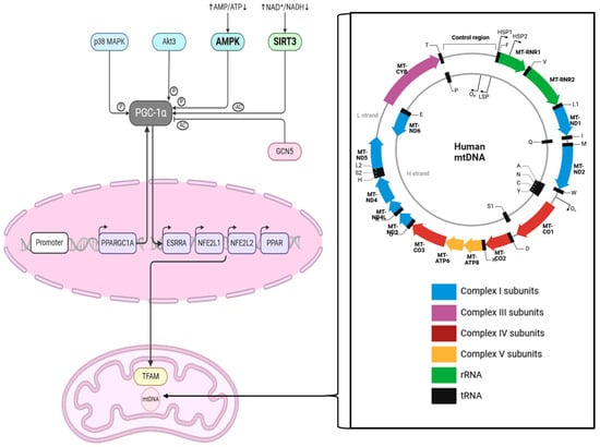 This scheme shows the interaction between SIRT3 and PGC1α and the cascade influencing TFAM in mitochondria. The zoomed-in box on the right-hand side shows the human mitochondrial genome, which is 16,569 bp long. Abbreviations: MAPK = mitogen-activated protein kinase, Akt3 = RAC-gamma serine/threonine-protein kinase, AMPK = AMP-activated protein kinase, AMP = Adenosine monophosphate, NAD = Nicotinamide adenine dinucleotide, NADH = nicotinamide adenine dinucleotide+ hydrogen, PPARGC1A = Peroxisome proliferator-activated receptor gamma coactivator 1-alpha, ESRRA = Estrogen receptor-related receptor, NFE2L1 = nuclear factor erythroid 2 (NF-E2)-related factor 1, NFE2L2 = nuclear factor erythroid 2 (NF-E2)-related factor 2, PPAR = Peroxisome proliferator-activated receptor, TFAM = mitochondrial transcription factor A, Ac = acetylation; P = phosphorylation. This figure was created based on the tools provided by Biorender.com (https://biorender.com/; accessed 24 August 2024) and adapted from [36,37].