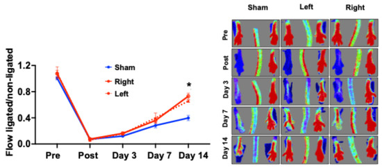 Donors’ BM-Mono were successfully isolated from the limb previously in ischemia (left limb) or from the contralateral limb (never ischemic—right limb) and injected into recipient mice 48 h after the ischemia training termination. Recipient mice received 24 h-trained (left or right) or Sham BM-Mono one day after undergoing hindlimb ischemia, and the LDI was performed. There was no difference in blood flow analysis between the groups before ischemia, immediately post-ischemia, and on day 7 after surgery. However, on day 14 after surgery, the recipients who received 24 h-trained BM-Mono from the left or the right limb demonstrated a significant improvement in blood flow recovery (Figure 1). Surprisingly, the BM-Mono from the contralateral limb had the same beneficial effect of improving perfusion in the recipient mice, indicating a potential systemic effect caused by ischemia training.