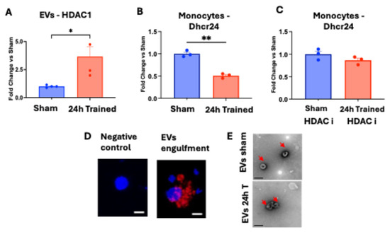 For co-culture of EVs and BM-Mono, EVs were isolated from the serum of 24 h-trained and Sham-treated animals via ultracentrifugation at 100,000× g for 2 h. WT BM-Mono were co-cultured with EVs from Sham and 24 h-trained groups for 16 h, and the RNA from monocytes was isolated, as detailed in the section above. In another set of experiments, we treated the WT BM-Mono with sodium butyrate at 1 mM for 60 min before adding the EVs and co-cultured them for 16 h. Sodium butyrate is an HDAC1 inhibitor used to assess whether this histone deacetylase contributed to the monocyte reprogramming process. As mentioned in the section above, total RNA extraction and cDNA from these BM-Mono was performed. Gene expression of Dhcr24 to assess whether EVs are responsible for the downregulation of Dhcr24 in BM-Mono was measured by qPCR. Data are expressed as relative fold change over the BM-Mono exposed to Sham EVs.
