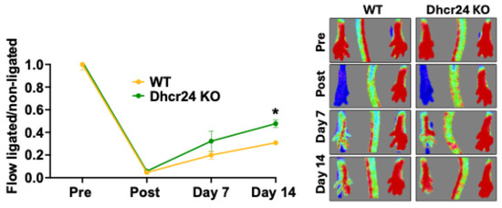 Adoptive transfer using Dhcr24 KO or WT BM-Mono. Wild-type recipient mice subjected to unilateral hindlimb ischemia received WT or Dhcr24 KO BM-Mono. Laser Doppler Imaging demonstrated improved perfusion in recipient mice with Dhcr24 KO BM-Mono (n = 3). Error bars represent SEM (* p < 0.05 vs. same timepoint).