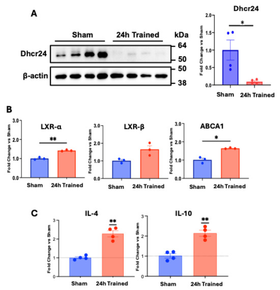 Ischemia training reprogrammed BM-Mono lipid metabolism. BM-Mono were isolated, and protein and gene expression were analyzed. Also, BM-Mono were subjected to macrophage M2 polarization protocol, and gene expression for M2 markers was performed. (A) Dhcr24 protein expression was downregulated in ischemic-trained monocytes. (B) These cells also showed upregulation of important genes downstream of desmosterol pathway: LXRs and ABCA1. (C) Gene expression of M2 macrophage polarization shows greater levels of M2 markers IL-10 and IL-4 on macrophages derived from 24 h trained BM-Mono. “Fold Change vs. Sham” represents the difference of 24 h Trained group related to Sham group expressed in fold change. Error bars represent SEM (* p < 0.05, ** p < 0.01).