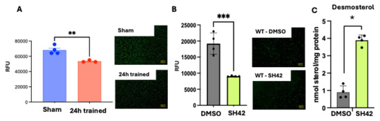 This experiment was performed as per Yang et al. [18] with some modifications. Briefly, C57BL/6 mouse primary aortic endothelial cells (ref. C57-6052) were plated on 24-well plates at 1 × 105 cells/well in 1 mL of complete mouse endothelial cell medium (both from Cell Biologics, Inc. Chicago, IL, USA). The cells were kept in culture for 3 days until they reached confluence. They underwent starvation overnight, and after that, they were activated for 5 h with m-TNFa. Meanwhile, BM-Mono isolated from Sham or 24 h-trained mice were stained with 2 µM of calcein AM fluorescent dye (Invitrogen Waltham, MA, USA) in a free medium at 37 °C for 30 min. Then, they were washed twice with PBS at 300× g for 10 min and resuspended in a complete medium, 1 × 106 labeled monocytes were added on top of the endothelial cells, and the plate was incubated at 37 °C, protected from light. After 1 h, the wells were washed three times with PBS. Finally, the fluorescence intensity of the labeled monocytes attached to the endothelial cells was measured in a fluorescent microplate reader at 488 nm of excitation and 517 nm of emission. For the monocyte adhesion assay using WT monocytes, we treated them with a Dhcr24 inhibitor called SH42. We repeated the protocol described above, but before calcein staining, WT BM-Mono were treated with SH42 at 1 µM or DMSO for 16 h and washed 3 × with PBS Desmosterol. quantification was performed as per Tallman et al. Briefly, cell pellets (≈700,000 cells in 100 µL PBS) were lysed with lysis buffer (500 µL: 50 mM HEPES, 150 mM NaCl, 0.1% TritonX100, 0.1% SDS, pH = 7.0 containing protease inhibitors) at 0 °C for 30 min. A 100 µL aliquot was used for sterol analysis and 20 µL aliquot for protein concentration (determined by BCA assay). To each sample, a sterol standard mixture (10 µL), antioxidant mixture (10 µL: BHT (2.5 mg/mL) and PPh3 (1 mg/mL) in EtOH), CHCl3:MeOH (600 µL, 2:1), and saline (300 µL) were added. The sample was vortexed well and centrifuged (5000 rpm for 1 min) to separate the layers. The CHCl3 layer was transferred to a new vial and dried under vacuum on a Thermo Savant SpeedVac (Thermo Fisher Scientific, Waltham, MA, USA). Derivatization and LC-MS/MS analysis of sterols was carried out as described in [19]. Endogenous sterol levels were quantified based on the known internal standard amount and normalized to milligrams of protein.