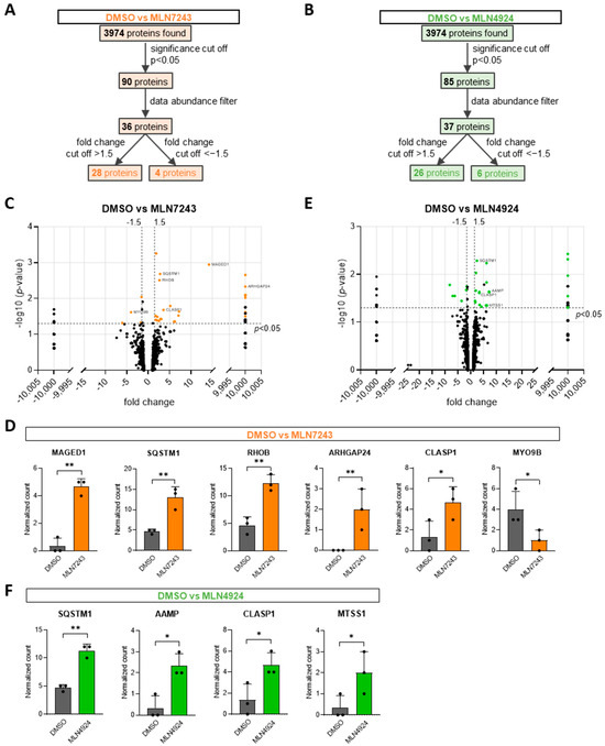 Proteomics screen to identify up- or down-regulated proteins upon inhibition of ubiquitination. (A,B) Flow chart on the analysis of the identified proteins in proteomics, for (A) DMSO vs. MLN7243 comparison and (B) DMSO vs. MLN4924 comparison. (C,E) Volcano plots of all identified proteins for each comparison. Significance cutoff and fold change cutoffs are marked with dashed lines. Orange marked proteins represent the 32 proteins after data analysis from (A), while green marked proteins represent the 32 proteins after data analysis from (B). (D,F) Normalized peptide counts of proteomics data for proteins after data analysis from (A,B), which are potentially involved in endothelial barrier regulation, (D) for DMSO vs. MLN7243 comparison and (F) for DMSO vs. MLN4924 comparison. * p < 0.05; ** p < 0.01.