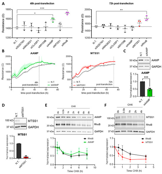 AAMP and MTSS1 are novel negative regulators of endothelial barrier function. (A) HUVECs were transfected with N.T., siSQSTM1, siMAGED1, siCLASP1, siMYO9B, siAAMP, siMTSS1, or siRhoB. Resistance of HUVECs 48 h and 72 h post-transfection is shown. The dotted lines show the respective N.T. values. Data are presented as mean ± SD, n = 3. (B) HUVECs were transfected with N.T., siAAMP, or siMTSS1, and resistance was measured over time. The graphs represent the time course of one representative experiment, depicted in (A), as mean + SD. (C) HUVECs were transfected with N.T. or siAAMP. Western blot analysis of AAMP expression 48 h post-transfection. Bar graph shows quantified AAMP expression normalized to GAPDH and N.T. Data are presented as mean + SD, n = 3. (D) HUVECs were transfected with N.T. or siMTSS1. Western blot analysis of MTSS1 expression 72 h post-transfection. Bar graph shows quantified MTSS1 expression normalized to GAPDH and N.T. Data are presented as mean + SD, n = 2. (E,F) Western blot analysis of (E) AAMP and RhoB and (F) MTSS1 and RhoB expression after 25 µg/mL CHX treatment for indicated time points. Graphs show quantification of (E) AAMP and RhoB and (F) MTSS1 and RhoB expression normalized to respective GAPDH and 0 h CHX. Data are presented as mean ± SD, n = 3–4. * p < 0.05, ** p < 0.01, and *** p < 0.001. HUVEC, human umbilical vein endothelial cell; N.T., non-targeting siRNA; CHX, cycloheximide.