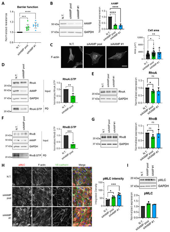 Notably, overexpression of AAMP, in turn, did not lead to improvement in endothelial barrier function, accumulation of RhoA or RhoB, or an increase in F-actin stress fibers’ formation, indicating that it is the lack of AAMP that interferes with EC function, while an excess of AAMP does not induce EC dysfunction. This could be due to downstream signaling or targeting proteins, of which the concentration is limiting, so that any effects of the ectopically expressed AAMP are not detected.