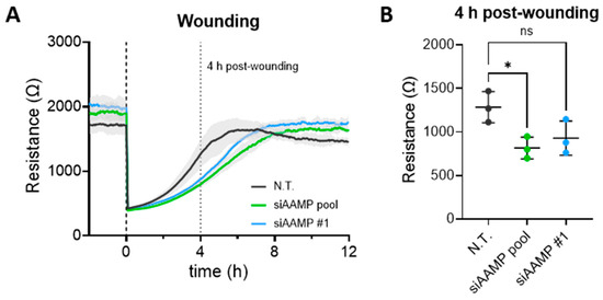Previously, it has been shown that AAMP plays a role in cell migration in various cancer cell types, but also in vascular smooth muscle cells and ECs [25,26,27,28]. Consistent with previous findings, depletion of AAMP led to a delayed wound closure compared to N.T. control in a wound healing assay performed with ECIS (Figure 4A). Conversely, silencing of AAMP did not affect the closure of a scratch in a HUVEC monolayer (Figure S4). Taken together, these data indicate that AAMP may play a positive regulatory role in regulating EC migration.
