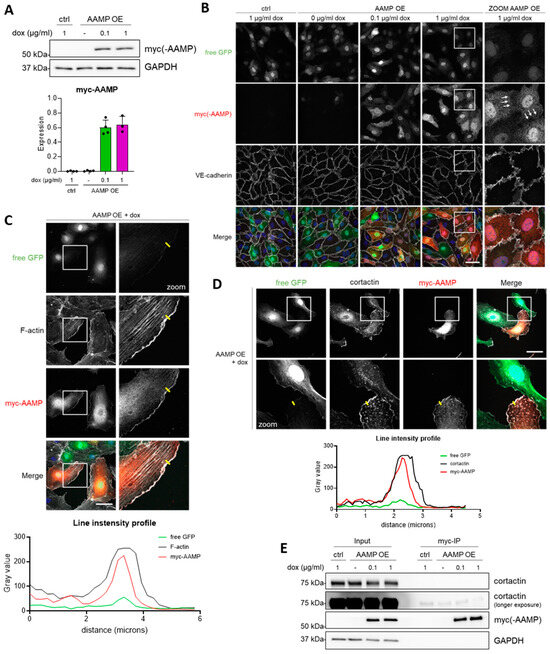 AAMP colocalizes with F-actin and cortactin in membrane ruffles. (A–E) HUVECs were transduced with ctrl or AAMP lentivirus and treated with the indicated concentrations of doxycycline for 24 h. (A) Western blot analysis for myc-AAMP expression. Bar graph shows quantification of myc-AAMP expression normalized to GAPDH. Data are presented as mean + SD, n = 3–4. (B) Immunofluorescent staining for GFP (green), myc-AAMP (red), and VE-cadherin (white), and counterstained with DAPI (blue). Scale bar represents 50 µm. (C) Immunofluorescent staining of sub-confluent HUVECs for GFP (green), F-actin (white), and myc-AAMP (red), and counterstained with DAPI (blue). Scale bar represents 50 µm. Graph shows gray values of all channels along the yellow line drawn in zoom images. (D) Immunofluorescent staining of sub-confluent HUVECs for GFP (green), cortactin (white), and myc-AAMP (red), and counterstained with DAPI (blue). Scale bar represents 50 µm. Graph shows gray values of all channels along the yellow line drawn in zoom images. (E) Myc-co-IP followed by Western blot analysis for myc-AAMP and cortactin. HUVEC, human umbilical vein endothelial cell; ctrl, control; dox, doxycycline; OE, overexpression.