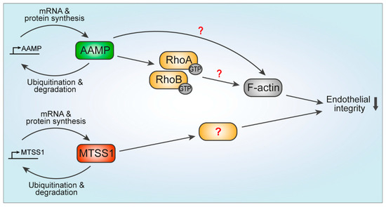 Model of AAMP and MTSS1 regulating endothelial integrity. AAMP and MTSS1 have a short half-life, hence, their turnover is tightly regulated by continuous mRNA expression, protein synthesis, and ubiquitin-mediated degradation. Mechanistically, AAMP controls stability and promotes activation of RhoA and RhoB, leading to impaired endothelial barrier function. Potentially, AAMP affects F-actin dynamics directly. MTSS1 is a novel negative regulator of endothelial integrity; however, the mechanism of regulation remains to be elucidated.