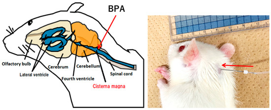 In the IV administration group, four rats received 350 mg/kg of BPA via the tail vein over 1.5 h. In the CSF administration group, BPA was administered to four rats via the intracisterna magna at a rate of 8.0 mg/kg/h for 2 h. All rats were anesthetized via an intraperitoneal injection of a mixture of anesthetics, including medetomidine (Nippon Zenyaku Kogyo Co., Ltd., Fukushima, Japan) (0.15 mg/kg), midazolam (SANDOZ, Tokyo, Japan) (2.0 mg/kg), and butorphanol (Meiji Animal Health Co., Ltd., Tokyo, Japan) (2.5 mg/kg). These experimental conditions are summarized in Table 1.