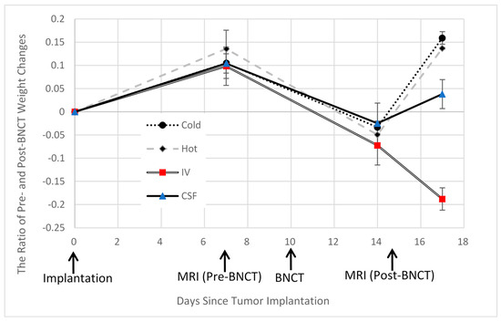 However, all rats in the IV method group experienced significant weight loss (Figure 5) and exhibited considerable debilitation one week after BNCT. Conversely, the CSF method group showed a relatively closer resemblance to the control group, with weight recovery observed.