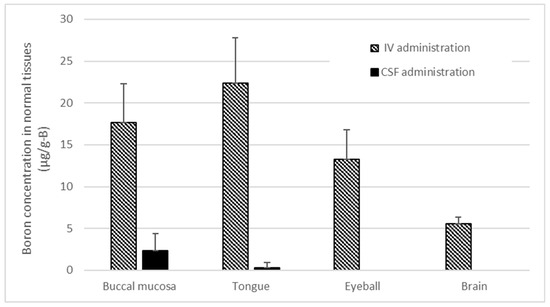 Figure 6 shows the concentration of boron accumulation in normal tissues of rat heads following the infusion of BPA via the tail vein and cisterna magna under conditions identical to those of the BNCT in this study. Particularly noteworthy is the significant boron accumulation observed in oral tissues with the IV administration of BPA, whereas CSF administration results in comparatively lower boron accumulation in normal tissues.
