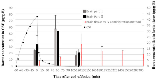 In our previous study, we investigated the pharmacokinetics of BPA in brain tissue by administering BPA via IV or CSF for 1 h in normal rats. After BPA infusion into the CSF was stopped, it was shown that the boron concentration in both the CSF compartment and normal brain cells decreased rapidly (Figure 8) [26]. This phenomenon can be easily explained by the fact that the primary function of the CSF is to facilitate drainage from the brain. On the other hand, BPA remained in the brain tissue for an extended period after IV administration. These results strongly support the findings regarding rats’ body weight changes in normal tissues discussed in Section 4.2. Additionally, we previously confirmed that BPA administered at 4 mg/kg/h via CSF in brain tumor model rats (melanoma) resulted in a similar level of boron accumulated in tumors to IV administration at 350 mg/kg/h [26]. This result is consistent with the pharmacodynamic analysis in the current experiment. From these findings, it can be concluded that BPA administration via CSF can achieve therapeutic effects comparable to those of IV administration with a lower dose and that rapid excretion of BPA from the CSF may result in a significantly higher T/N ratio for CSF administration.