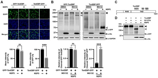 SARS-CoV-2 NSP5 targets Q1127 of TonEBP. (A) HEK293T cells were co-transfected with the plasmid expressing either GFP-TonEBP (see above) or TonEBP-GFP (GFP is conjugated to the C-terminus of TonEBP) along with the empty vector or His-tagged SARS-CoV-2 NSP5-expressing vector, as indicated. At 48 h later, the cells were fixed and stained with DAPI. Fluorescence images for GFP, DAPI, and the two merged are shown. Scale bar: 100 µm. GFP fluorescence intensity was quantified as the mean ± SEM, n = 3 (bottom). (B) Cells were transfected for 24 h with constructs as in (A). The cells were then treated for 6 h with vehicle (DMSO) or 10 μM MG132 before immunoblotting. Full-length GFP-TonEBP and cleaved GFP-TonEBP are marked by solid and open arrowhead, respectively. Relative intensity of the cleaved GFP-TonEBP (open arrowhead) was quantified as the mean ± SEM, n = 3 (bottom). (C) Schematic of TonEBP primary sequence with putative cleavage sites marked with Qs predicted using NetCorona1.0 (with a score higher than 0.35). RHD, Rel-homology domain; TAD, transcription activation domain. (D) Cells were transfected with various combinations of plasmids expressing GFP-TonEBP (TonEBP), GFP-TonEBP with Q1127A mutation (Q1127A), and NSP5, as indicated, before immunoblotting. ns p > 0.05, and *** p < 0.001 using t-tests (A,B).